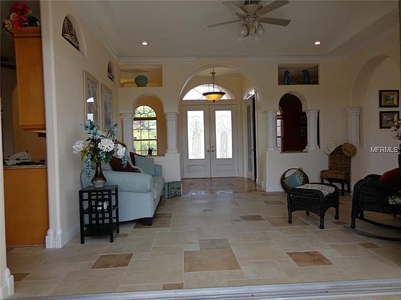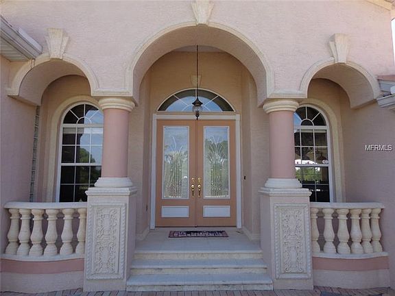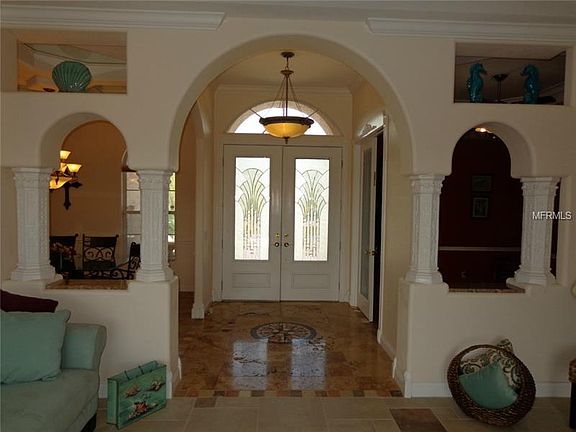 Waterfront home is former builder''s model. Beautiful paved circular driveway leads to side entry garage and front porch of this Mediterranean style home. Double entry front doors open into foyer with marble inlaid floor, high ceiling lines and wonderful exterior views. Numerous upgrades include but not limited to leaded glass,solid maple cabinets, copper pendant lights, crown molding, Roman columns, and unique architectural details. Numerous sliders and windows allow lots of natural light to create bright rooms throughout. Kitchen opens into family room and allows for comfortable sitting areas and easy communication with guests and family members. Formal dining room with coffered, mirrored ceiling provides opportunity for sit down dinners while nook encourages casual entertaining or light meals. Office/den off the foyer features bamboo flooring and glass shelves. Several rooms with sliders open to the tiled lanai and screened, enclosed pool area. Enjoy the saltwater pool with solar panels keeping the temperature comfortable for year-round swimming enjoyment. Flowing waterfall creates relaxing atmosphere as you enjoy the outdoor living space. Wonderful home with lots of living space the discriminating buyer will want to view.