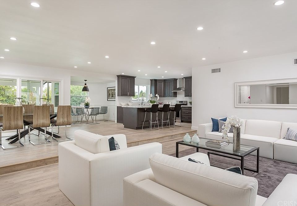 A Modern Masterpiece! This Top of the line, state-of-the-art home is everything you could ask for and more! From the long private circular driveway onto the magnificent large lot of approx. 17,500SF with the sparkling pool and lounge area. The open concept kitchen and dining room steps down into your formal living room, great for entertaining! New flooring throughout, 4 spacious bedrooms, and 3 upgraded bathrooms with custom vanities and quartz counters. The kitchen has quartz counters, a huge center island, brand new stainless steel appliances and a large sunny breakfast room. The master suite has vaulted ceilings, a substantial walk in closet, a private bath with a shower / luxurious soaking tub, elegant his/her vanity. Walk outside from the master-suite through an sliding glass door to the private backyard. Centrally located, adjacent to Sherwood Forest, near CSUN, key location to 118 HWY. 101 HWY & 405 Hwy. Certainly this one is a one-of -a-kind!!