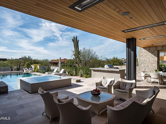 Under a tongue-and-groove wood ceiling with built-in heaters, the patio becomes a year-round destination. A pass-through bar connects seamlessly to the kitchen, enhanced with two refrigerated beverage drawers for poolside refreshments. Step outside to an elevated spa spilling into the heated pool, set against a dramatic fire feature and wide-open viewswhere colorful sunsets steal the show night after night.