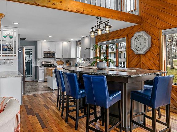Welcome to Serenity Point the ultimate Lake House retreat. Gorgeous open concept home with panoramic lake view. Fireplace with vaulted ceiling. Newly remodeled first level 2016. New kitchen with granite countertops and stainless steel appliances, dining and living room area with one-of-a-kind hardwood floors, new spacious half bath/changing room. Large 18x28 deck with built-in benches and rope railing for an unobstructed view. New 21x6 front porch 2020. Upper level includes two bedrooms with remodeled Jack and Jill bath 2020. Master suite with Lakeview and balcony and newly remodeled bath 2020, walk-in closet, and attached office, or office can be used as an extra closet. Covered boat dock with oversized boat slip, kitchen, bathroom and ample storage room. New beach 2021. Private mini cove for swimming which also cuts down on waves for parking a boat. One of the easiest docks on the lake to park a boat, protected from wind and wake but still close to open water. Riprap added around the entire point of property. One of the prettiest points on the lake. Irrigation system using lake water to water the grass.