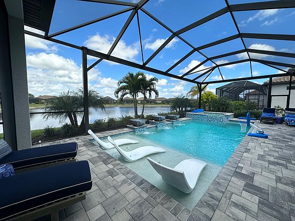 Enjoy a wonderful, gated community and a brand new Naples luxury home at Esplanade Golf & Country Club. This is the coveted Mercedes floor plan with the bonus second floor. This home is gorgeously decorated with all high-end furniture and finishes. When you first enter the open-concept main living area, you will find a giant great room with a 85 inch tv and surround sound, as well as a 20 foot glass sliding door that leads out to the lanai. The gournmet kitchen includes a huge island as well as a separate wet bar. There is an eat-in breakfast table in the kitchen that seats 4. In addition, there is a formal dining room with seating for 8, as well as a den/office with french glass doors, desk and chair, tv, and 2 chair seating area across from the desk - these rooms are on your left and right, respectively, when you walk in the front door. The home has 4 bedrooms (3 downstairs and 1 upstairs), all with en-suites and custom closets, and 5.5 baths in total. The giant master bedroom (king-bed) a large custom closet and a spa-like master bathroom encompasses one wing of the first floor. 2 more bedrooms one with a king size bed and one with a queen size bed make up the opposite wing of the first floor. Upstairs you will find another bedroom with a king size bed that acts as a second master. Technology abounds - there are 8 TVs with Sonos speakers throughout the house (downstairs and upstairs masters, great room, upstairs bonus room, office, outdoor kitchen, outdoor fireplace) and 5 zones of in ceiling speakers. All can be controlled with the Sonos app directly on your phone. High speed internet access is included as well. An alarm system and electronic keypads gives you additional piece of mind. Send the kids (or adults) to the upstairs giant bonus space that has 75 inch tv with surround sound, a large sectional and ottoman, 2 sofa chairs, as well as foosball, air hockey, shuffleboard, Xbox and classic Arcade games. The bonus room has it's own full bathroom so you can enjoy the upstairs for hours on end. Outside, you will find an incredible oasis. On one side of the 1200 square foot+ silver travertine paver lanai you will find a giant custom outdoor kitchen with a 20 foot wall (w/ a 24 x 48 inch tile backsplash) and a 85 inch tv, outdoor cabinets, giant grille, hood, sink, and 10 foot island with a waterfall quartz countertop. On the other side of the lanai, you will find a beautiful outdoor fireplace area. The 10 foot wide, bump out fireplace wall features a 60 inch gas fireplace with glass stones, 24 by 48 inch tiles from floor to ceiling, and a 65 inch tv above the fireplace. Surrounding it is indoor-like, incredibly comfortable, sectional seating area. Most importantly, you will find a spa-like pool area. The pool features a sun shelf on one end with 3 water loungers and 2 bubblers, as well as 3 raised columns with spillovers. The raised spa features a stairstep spillway. with a pretty view of the sunset. Both have a beautiful view of the lake. The entire lanai is protected by a panoramic screen/cage. Just bring yourself, as the house comes with everything you can think of. The high end kitchen is fully appointed with everything for the family chef, and the bedrooms and bathrooms are stocked with towels, sheets and toiletries so you can arrive and start to enjoy your vacation immediately. Esplanade Golf & Country Club features resort-style amenities in an active lifestyle, gated community with serene lakes, lush landscaping and a pristine community. There is an award-winning Championship 18-hole golf course, as well as tennis, pickleball, and bocce. Enjoy over 14 miles of walking/biking trails, a giant fitness center with every class you can imagine, as well as a full-service spa. A full time activities director ensures their are plenty of activities planned for everyone. You will also find a resort style pool that offers cabanas, pool towel and wait staff service, paired with the Bahama Bar which offers lunch, dinner, and cocktails year round. The 15,000 sq foot Culinary Center features an array of dining experiences both indoors and out. There is a wine tasting room, a fine dining restaurant, a bar & grille style restaurant, as well as a cafe if you want to grab a quick breakfast or lunch. Our golf membership is fully transferable for only $600. The renter essentially takes over all of our membership benefits (not just golf) and has access to all of the amenities listed above as if they were the owner. Additional $650 cleaning fee and $600 transfer fee are not included in the monthly price. 30 night minimum rental. Available from December 1, 2024 to January 31, 2025, whole months only.