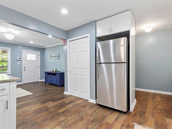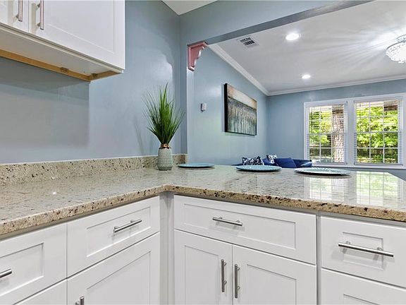 - Kitchen Features: Breakfast Bar, Eat-in Kitchen, Pantry, View to Family Room, Stone Counters, Kitchen Island, Solid Surface Counters, Cabinets White