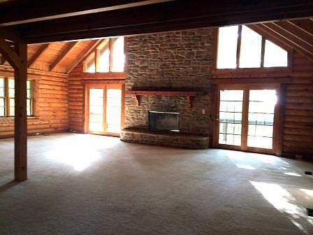 Beautiful luxury end log cabin on 8 acres with wrap around porch. All opened inside with exposed beam ceilings. Loft master bedroom, 2 stone fireplaces, available area for 3rd bedroom. Secluded and private. Pond with dock and swim area.