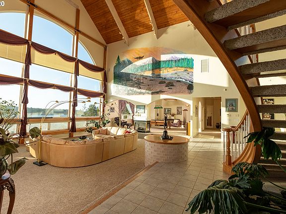 Riverfront mansion on 1.9 acre lot. In-town location w/stunning views. Gated & paved driveway. 5 bdrms, 5 baths, Master Suite & Grand Master Suite. 8600+ sq.ft. of living space is built to take advantage of views. Gourmet kitchen w/many upscale amenities + built in eating area & is open to formal dining area. Living room has unique architectural details & is open to the upper loft. Home also features game room, workshop, exercise room, office & guest quarters. 4-car garage & riverside beach.