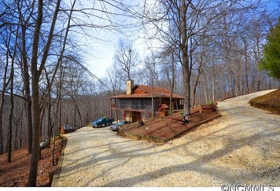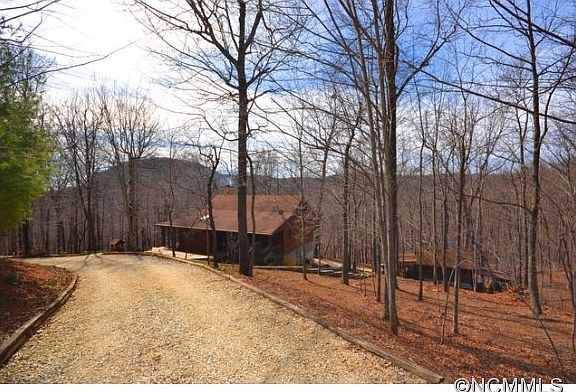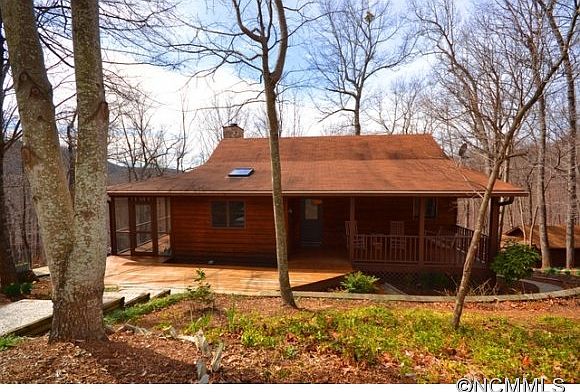 Rustic tranquility with wood walls, floors and ceiling, an open floor plan, a skylight in the kitchen + an island, master suite, covered porch, screen porch & sunroom, all on the main level. The lower level has 2 bedrooms, a full bath, a family room and has both interior and exterior entrances plus a 1 car garage. Beautiful wooded setting on 4.88 acres with an outbuilding. Winter mountain view.