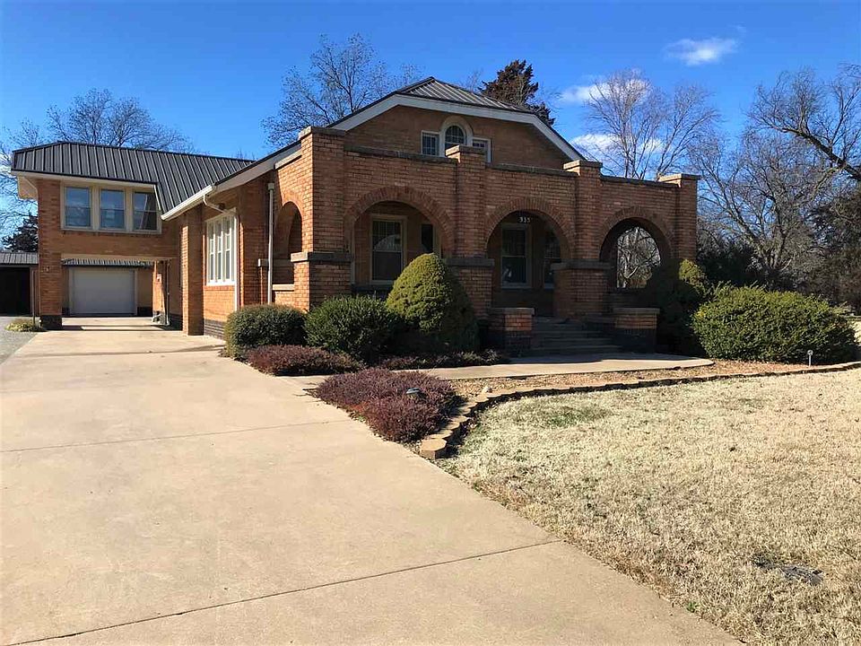 Motivated Seller! This unique brick Spanish tudor style home with arches enhancing the covered front porch. It boasts a large living area with a built-in fireplace surrounded by enclosed bookshelves. An adjacent area to living room could be used for an office, music, hobby or second living room. Formal dining leads into kitchen with well maintained wooden cabinets & pantry. Amenities include: Hardwood floors, natural oak woodwork, Travertine stone backsplash & portico.