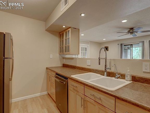 Located in the heart of Lower Skyway and School District 12, this rare west side condo is freshly painted and ready to move-in! This spacious condo features sunny, south-facing windows and a private balcony with green views of Cheyenne Mountain. The functional, open layout includes an enormous living room with wood laminate floors and a spacious closet for storage. The bedroom boasts beautiful French doors, and a separate, private entrance to the large bathroom with an extra deep tub. The kitchen has been recently updated with warm wood cabinetry and stainless-steel appliances. All utilities included except for internet. Owner pays for water and electric. One parking space is also included. There is room in the apartment for a small stackable washer/dryer or laundry facilities are very close. Renter to pay for internet. Cats are allowed. Absolutely no smoking. 1 year lease required.