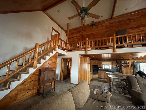 Check out this cozy, cabin style home! This home features 2 bedrooms, 2 bathrooms and an upstairs loft that could be converted into a 3rd bedroom. Walk out of the front door and enjoy a nice view of the beautiful pond in the front yard that also has the cutest dock out over the water. *The soffit on the wrap around porch does need replaced.*