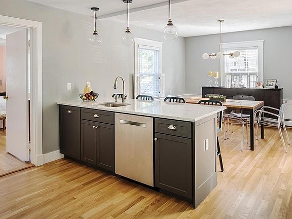 Lovely updated 4 bedroom, 2 bathroom Colonial near Needham Center! Fall in love with this warm and stylish home! Gorgeous 2016 kitchen w/custom cabinetry, quartz countertops, large peninsula w/breakfast bar, new stainless appliances, beautiful tile backsplash, & open layout to the dining room. The first floor also features a living room w/fireplace, a large family room w/skylights that overlooks the deck and backyard, and a first-floor bedroom suite that includes a bathroom with shower (perfect as either master bedroom or guest suite). The second floor offers 3 gracious bedrooms and a full bathroom. 2016 hot water heater and upgrade to 200 amp electrical service. Additional potential in the spacious basement, which has its own heat zone. The large wrap-around back deck overlooks a spacious backyard. Garage, plus driveway parking for several more cars. Fabulous location near schools and approximately half a mile to both Needham Center and to the Needham Junction commuter rail station.