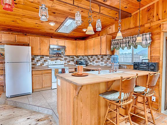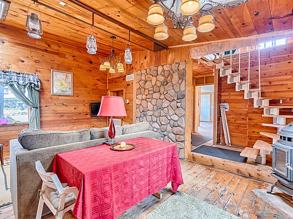 Amazing cabin w/ history just out of town w/ Mountain Views! [**Home not completed!, so only CASH or Renovation Loan?] You'll fall in love from the old horse hitch post, to walking under tall trees through the door and seeing wide wood-plank floors, tree post decor, butcher block counter, pellet stove, vaulted ceiling, & imported Italian staircase! Wood from the old corral makes up the walls and ceiling, then they added modern accents: solid core doors, new kitchen cabinets, tile floors, and a totally remodeled bathroom and utility room. Add in a practically new furnace, hot water heater, washer and dryer, then finish the 2 bedrooms & loft to make it your dream cabin or investment property! The enormous, block garage/workshop w/ raised wood floors has 6 skylights, wood stove to hook up, tw