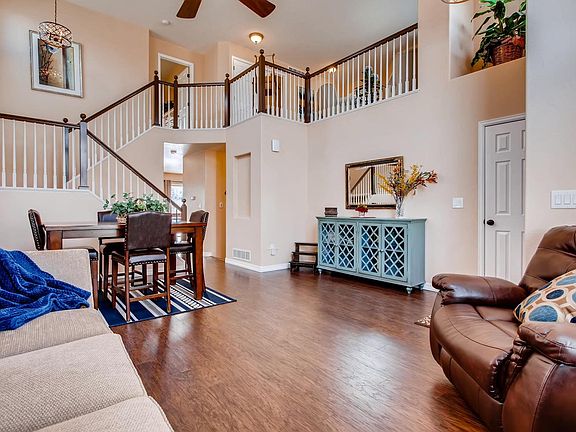 Gorgeous 2 Story home in Chatfield Bluffs! 3Bedrooms, 2 1/2 bath plus large loft. Main floor features living room/dining room or use as large family room, spacious kitchen with granite counter tops and stainless steel appliances, 2nd living space off kitchen with gas fireplace, updated half bath and laundry. Beautiful manufactured hardwood floor on main level. Upper level features master bedroom suite with 5 pc bath and private deck, 2 spacious bedrooms, full bath and large loft. Basement is finished as large family room. 2 tier deck and backs to green belt. Stamped Concrete front entry patio.