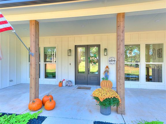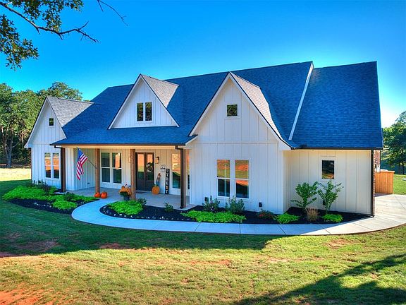 **1% of loan amount up to $3,500 lender credit with Dawson Hendricks Sovereign bank.** Beautiful custom modern farmhouse situated on 3 acres within the confines of a gated community. You will also enjoy approximately 300' of water frontage from your own backyard! Welcome inside where you will find vaulted living and master ceilings, sound barrier in all walls, quartz countertops, 36" iLve gas range, custom floor to ceiling cabinets with soft close and a beautiful rock fireplace. Enjoy the covered porch and entertain guests with the outdoor kitchen. Exterior includes features like sprinkler system, wiring for future shop, generator transfer switch, 10X16 shed and an inviting entry with a 230-foot concrete driveway. Garage is 2.5 spaces providing extra room for storage or your own garage gym and an underground storm shelter. The community includes eight ponds, mature trees, paved roads and more. Easy access to city conveniences and I-35. This home is luxury, nature, and convenience all in one. There is so many more stunning features to this home, schedule your private showing today!