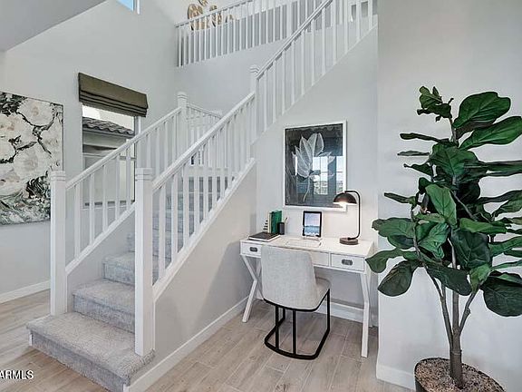 Split floor-plan creates privacy to the primary bedroom, with loft between the additional bedrooms. Laundry room has cabinets and includes washer & dryer. All home finishes have been upgraded, home faces north south and backyard has extended paver patio with firepit and opens up to common area!