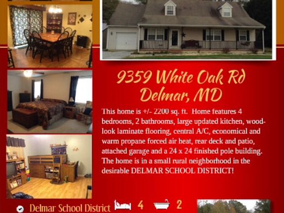 This 2200 square foot single family home has 4 bedrooms and 2.0 bathrooms. This home is located at 9359 White Oak Rd, Delmar, MD 21875.