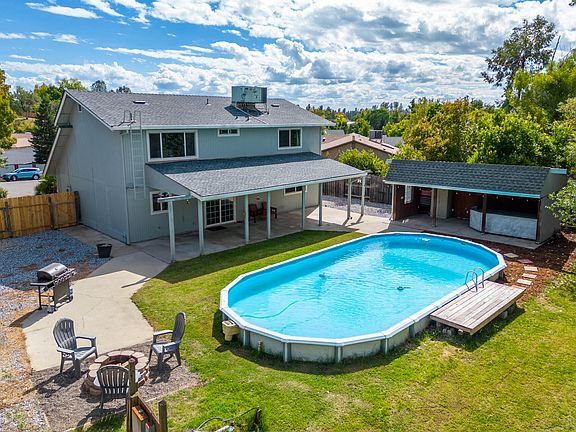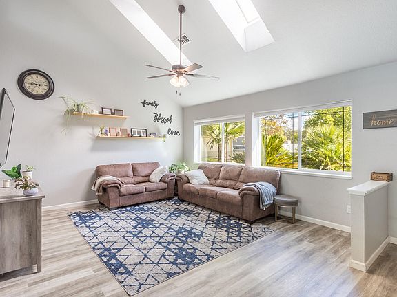 Welcome to this charming home offering the perfect blend of comfort, style, and functionality in a quiet cul-de-sac! Featuring a low-maintenance landscaped front yard with ample space for your boat or RV! Step inside and be greeted by a spacious living room featuring vaulted ceilings and strategically placed skylights that infuse the space with natural light. Open concept design seamlessly connects living, kitchen and dining areas, perfect for gatherings and everyday living. The kitchen boasts elegant granite countertops and has access to the backyard making outdoor entertainment a breeze. 3 generously sized bedrooms and 2 bath & office! Step outside to a spacious back covered patio with well-designed concrete and paver walkways to the charming fire pit are, shed, covered bar and POOL!