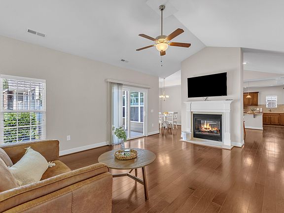 Beautiful condo-style home in the sought-after Villas of Wake Forest with most living space on the main floor. Open concept layout features a granite kitchen with stainless appliances and double oven, dining area, keeping room, and living room with hardwood floors and natural light. First-floor primary suite offers vaulted ceilings, dual closets, and walk-in shower; additional bedroom and full bath with walk-in tub plus an office/guest space complete the level. Upstairs includes a spacious bonus or third bedroom with full bath and large closets. Custom closet shelving throughout and oversized two-car garage provide excellent storage. Community amenities include pool, clubhouse, and social activities. Conveniently located near Wegmans, Sam's Club, and The Grove at 98.