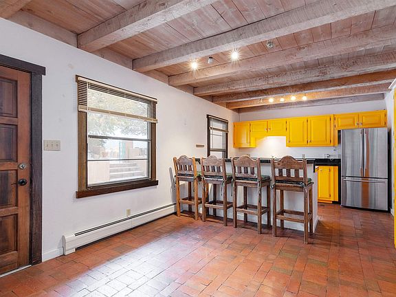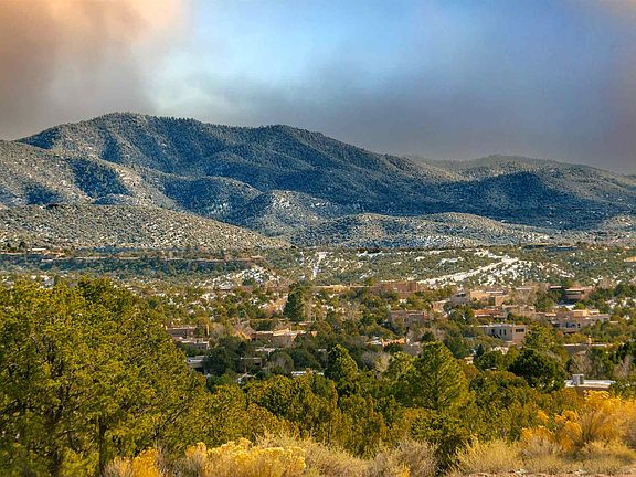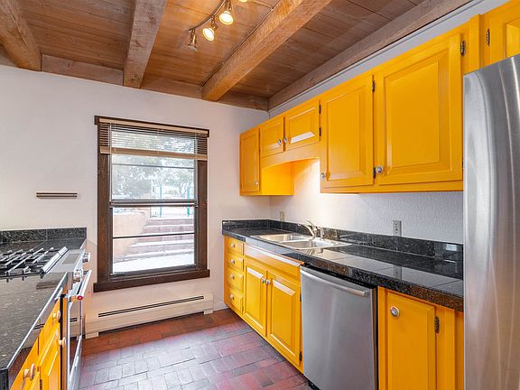 Just 4 min and 1.5 miles from the plaza, this bright and sunny single level 2 bedroom, 2 bath home in the North Hills Compound is close to museums, trails, restaurants, shopping, and groceries. The delightful views of the Sangres surround this end unit condo with New Mexico's timeless beauty, along with mature piñon trees, birds, garden space, and a walled flagstone patio. Light radiates through the large north-facing windows of this 1200 sq. ft gem, yet it feels private and secluded, tucked in the trees. The colorful and fun kitchen boasts stainless steel appliances, gorgeous marble tile counters, a high-end gas stove, adorable accent knobs, and brick floors. Crowned by wooden beams, the dining room and foyer open into the mountainous view-filled living room where you can enjoy the serene atmosphere from the cosy shepherd's bench and charming kiva fireplace, along with hardwood floors and built-ins. Both bedrooms are nicely separated into their own wings and have walk-in closets. The master has its own attached bathroom with tub, and separate vanity area, while the guest wing has closer access to the shower and an extra laundry/linen/storage room. The windows of this end unit allow the fresh cool air and cross breeze to float through gently. Along the flagstone patio there is an additional storage closet. This well-maintained, lovingly updated, and welcoming space makes a great home, artist retreat, 2nd getaway, or long term rental.