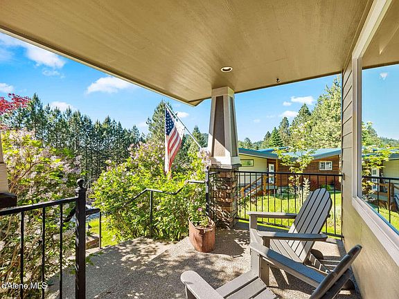 Mountain views abound in this 4 bedroom, 5 bathroom home tucked into a serene, rural-feeling neighborhood, just 5 minutes from downtown. Enjoy mature trees and a park-like backyard, with only meadows and woods behind you and an abundance of wildlife. Step inside to an open concept layout combining kitchen, dining and great room for seamless entertainment. This custom home boasts high quality materials and features: custom built-in knotty alder cabinetry, floor to ceiling windows, 2 gas fire places, smart lighting system, A/C, a remote auto shade, under cabinet and toe kick lighting, full length deck, in-ground sprinkler system, automated exterior lighting, and more. Two main floor spaces offer potential office, hobby or craft room options. The basement could be set up as a studio apartment, complete with bedroom, bathroom, living room with wet bar area and garage entry. Enjoy evenings around the firepit or strolling the rural neighborhood park, or pop down to CDA or the lake!