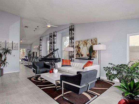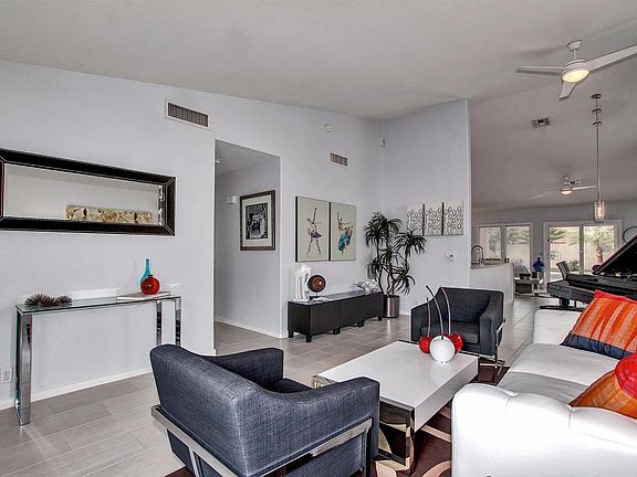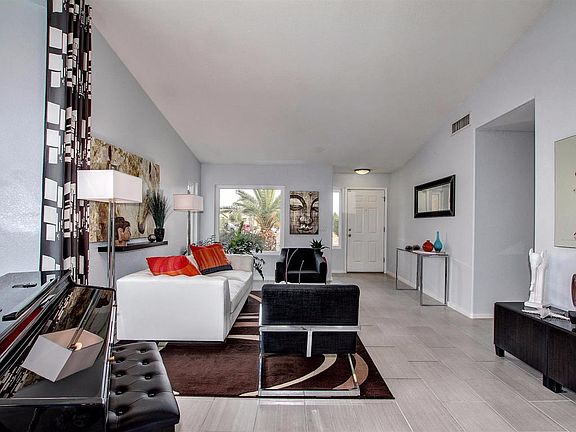 Outstanding ''Model'' perfect Home! Exquisitely remodeled top to bottom!!-a must see! Dramatic soaring ceilings, contemporary interior palette, New windows, upgraded lighting/ceiling fans, and beautiful wood ''look'' tile floor throughout. European style kitchen cabinets, stylish hardware, glass backsplash, SS appliances,gas range, quartz counters. Perfect Home for entertaining inside and out. Patio access from family room. New upscale bathrooms with designer tile, fixtures, and mirrors. French doors to patio from master retreat with spa-like private en suite. Spectacular backyard boasts covered patio, sparkling remodeled diving pool, meticulous desert landscape, gazebo, palm trees. New AC System,New Hot Water tank, Home has Solar! Do not miss an opportunity to own perfection!
