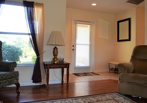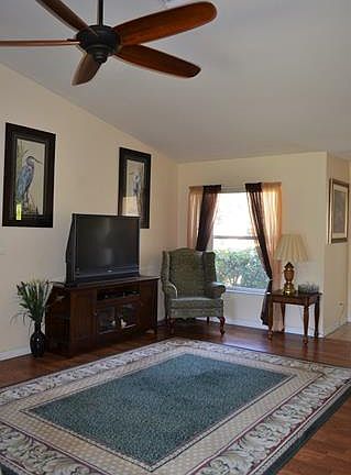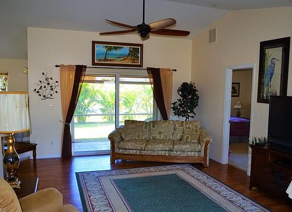 This home has been ideally built for the 1st time buyer, seasonal resident, or those looking to simply downsize. Walk in to a great room with cathedral ceiling, warm laminate flooring, sliders to the lanai and ample room for entertaining. The spacious kitchen offers both a breakfast bar and dining area with lots of cabinet and counter space. The Master bedroom has both his and her closets and leads into a master bath featuring double sinks in the vanity, a modern and very private tiled shower with neutral tiling. All three bedrooms are carpeted and the wet areas are tiled - all in neutral colors, so it's easy to add your furnishings. Other features include : an in-home laundry room with space to add a washtub or cabinets, mature landscaping, a bountiful fruit tree, areca palms to provide privacy, and great curb appeal. The owners have maintained this home so well you can move right in. New Lawn Irrigation system being installed 2017. Hurry in and see this lovely property before your neighbor does !!