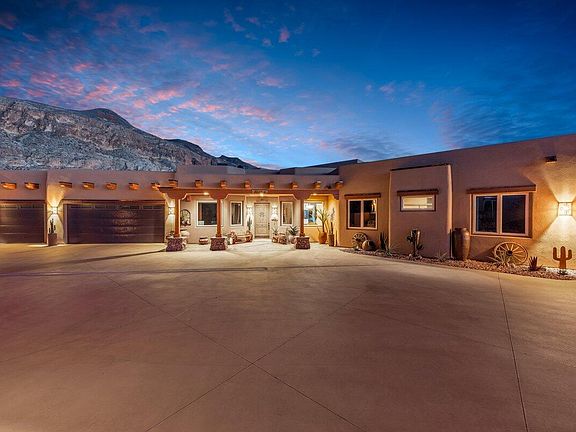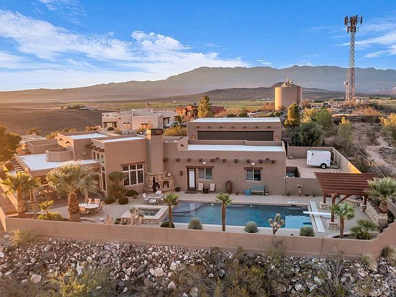 HIGHEST AND BEST DUE BY TUESDAY 9/16 AT 1PM. Your private hilltop retreat! Perched on its own 1.8-acre private hilltop, this stunning 4 bedroom, 2 1/2- bath, custom Santa Fe style home offers panoramic views of the Hurricane Cliffs, Pine Valley, and Copper Rock golf course - all best enjoyed from the expansive wraparound patio/veranda. Perfect for both relaxing and entertaining, the outdoor living space features a 20 X 40-foot pool, hot tub and outdoor kitchen. Inside, you'll find a timeless luxury kitchen with thick cut granite countertops and top of the line appliances, designed to impress the most discerning chef. A private road leads you to this one-of-a-kind estate, complete with a detached 48' x 34' x 12' shop featuring an additional ½ bath and both 110 and 220 power throughout. Onsite RV hookup with 30-amp power and sewer provide added convenience, making this property as functional as it is beautiful.