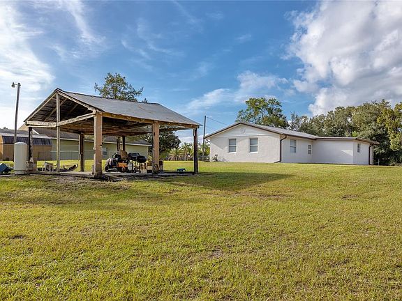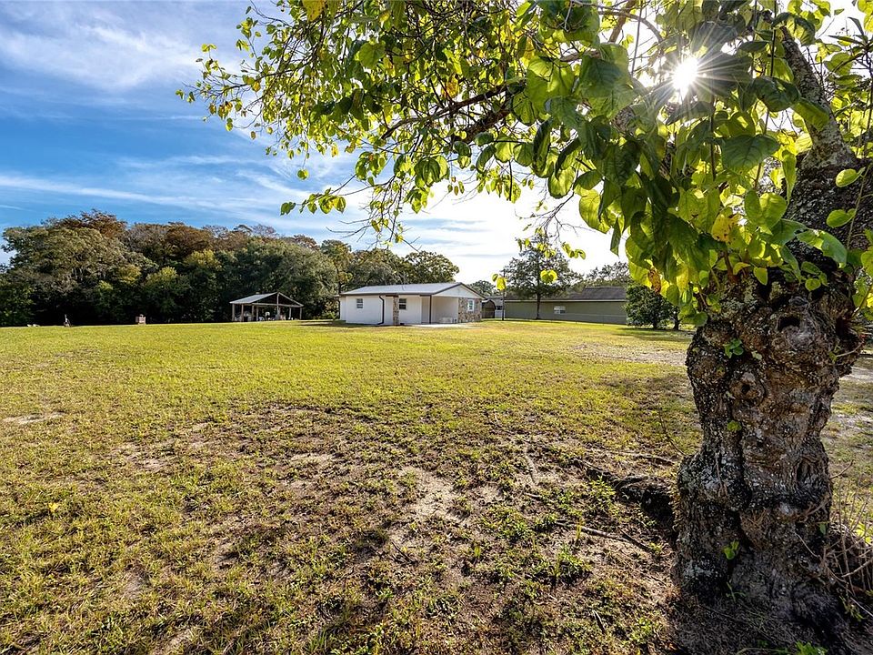 Country Living! Take a piece of peaceful serenity on this beautiful property that backs up to the woods and green mature trees! This three bedroom block home has polished terrazzo floor throughout with accents of tile in one bedroom and the bathroom. The bathroom has been updated with a natural tone tile and wall niche. Kitchen has white updated appliances and oversized large white sink with window for bright light. Updated metal roof, tankless water heater, and newer AC! Schedule your showing today to bring all the big Toys and livestock!
