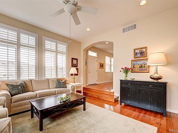 Incredible opportunity to own a large, end unit in Highlands at Stonegate. This wonderful 3 bedroom + loft home features over 2,300 square feet and a large 2-car attached garage. Upon entering, you will immediately notice the wall of windows with brand-new plantation shutters allowing for natural light on the main level. Also on the main level is a large family room, dining room, 1/2 bath, and an open kitchen with eat-in space, pantry, subway tile, white custom cabinets, and stainless appliances. More, the main level features gleaming hardwoods, a cozy gas fireplace, built-ins, and access to a large, covered patio for evening BBQs. Heading downstairs, there is a large 3rd bedroom, 3/4 bath, plenty of room for storage, and access to the garage area. Head upstairs to be delighted with the open layout. The master bedroom is upstairs and features a walk-in closet, a private deck area, and a master bath! The additional bedroom is good sized and also has a walk-in closet. This amazing townhome is located in a community that features 3 swimming pools, tennis courts, rec rooms, A+ schools, miles of walking trails and parks nearby. You will love living in this Stonegate Community. The location is 2nd to none and features quick access to DIA, DTC area and shopping just minutes away! Water/sewer/trash are included in HOA.