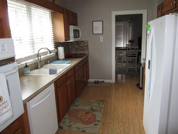 Be welcomed to this sweet bungalow by the covered front porch where you can sit and enjoy the fresh air! Step inside to admire the cozy feel of fresh paint, new lighting fixtures, updated full and half baths, as well as a living room with fireplace, formal dining room and efficient kitchen. Master bedroom offers a walk in closet while second bedroom offers two smaller closets. Great sunporch area, currently serving as an office space, offers versatility. Covered deck allows you to overlook the almost one acre lot and beautiful landscaping. Detached one car garage and outbuilding accent the exterior. Convenient to town but feels like a country setting. Ready to start packing and make a move? Call today for your tour of the charming property!