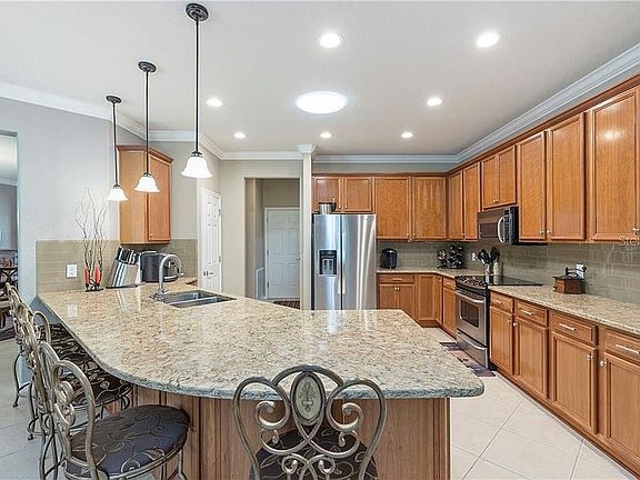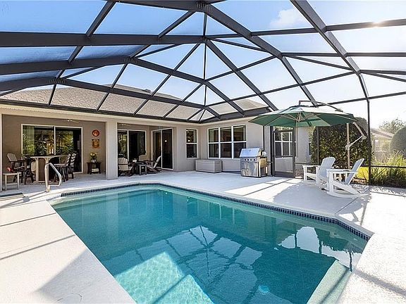 Custom Kingston 3+den/ 3 car garage. New Roof 2023, Custom pool with large entertaining space all covered by oversized screen enclosure for year-round use. Pool pump 2018, Built Right pool heater 2022, and covered entertaining space. Exterior custom painted, paver drive and walkway leading to 8' storm door at entry. Custom landscaping has extensive hardship with cement edging, river rock, palms and hardy plants, micro watering for each plant in all front gardens. LED lighting to accent gardens completes the look. Enter thru the 8' front door with 2 side lights flooding the foyer with daylight, custom built den with french doors, custom workspace, large living room area with custom Bar, lighting for entertaining. Crown molding, custom paint, custom ceiling fans and LED lighting fixtures throughout. Tile and custom wood flooring throughout, solar tubes, custom blinds/shutters, and murphy bed with matching shelves and drawers in guest bedroom. Master Bedroom has custom shelving in walk-in closet for extensive wardrobe. Kitchen has 42" cherry cabinets with crown molding, glass subway backsplash, kitchen faucet with lifetime warranty. New custom cabinets under island for amazing storage and Cambria quartz countertop. Baths also have Cambria quartz countertops; guest bath has vessel sink and all baths have Hans Grohe faucets and Kohler sinks in master. Laundry has full custom white cabinets for additional storage. 21 seer Amana AC and air handler with Aprilaire whole house filter installed in 2016. Garage is a storage dream with 2 heavy duty HyLoft garage ceiling mounted storage shelves, New premium water softener and hot water heater 2023, 10 circuit generator transfer switch with 30-amp power outlet box, LED lighting, custom hidden electronic roll up garage screen and insulated radiant barrier installed on garage doors.