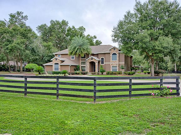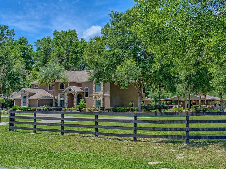 Ride, bike or walk out your drive to the Florida Greenway trails from the most highly sought after neighborhood of Turning Hawk Ranches II! Stunning and extremely well maintained 5/3/1 home on four beautifully landscaped acres. The light and bright open concept two story home features volume ceilings, two living areas and formal dining room with striking wood floors. A lovely upgraded kitchen with granite countertops, stainless appliances including wine cooler opens to the family room with fireplace. The 5th bedroom which provides a separate entrance could be in-law quarters or additional living space. Also an office and gorgeous outdoor living area complete with kitchen and covered patio. This private and turn-key property also offers an amazing and uniquely designed new 4 stall barn