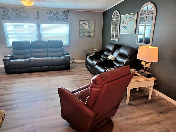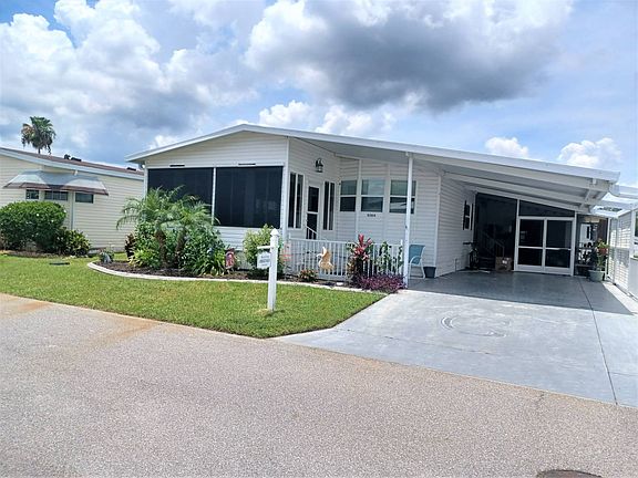 This 1994 Palm Harbor 2 bedroom 2 bath home has many amazing upgrades including granite countertops in kitchen and bathrooms, new vinyl flooring throughout and a spectacular barn door in the living room. The sunroom has brand new glass windows, is tied to the central A/C and has remote controlled sunshades mounted on the outside of windows to add more insulation from the sun. The home features tape and textured walls, crown molding, fresh paint and double pane windows that have privacy film on the lower half. Double vanities, brand-new, upgraded walk-in shower and plenty of linen storage space is offered in the master bathroom, and a tub/shower combo in the guest bath. There is an additional outdoor screened lanai. The huge shed (24 x 11) has a sink and workbench. The gardens are beautiful and had professional curbing installed. New A/C in 2018. Roof age is unknown but was inspected in 2021 and received a clean bill of health. This home is being sold partially furnished.