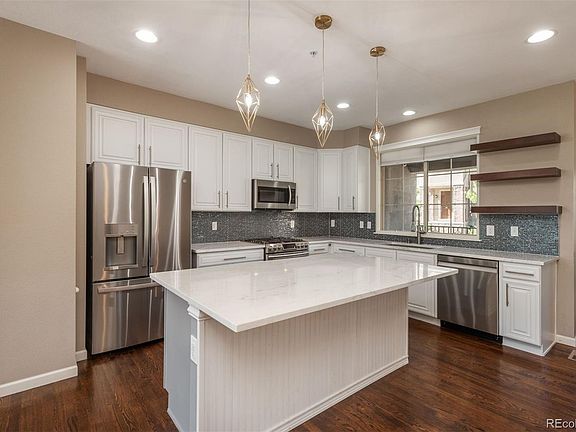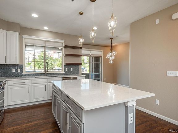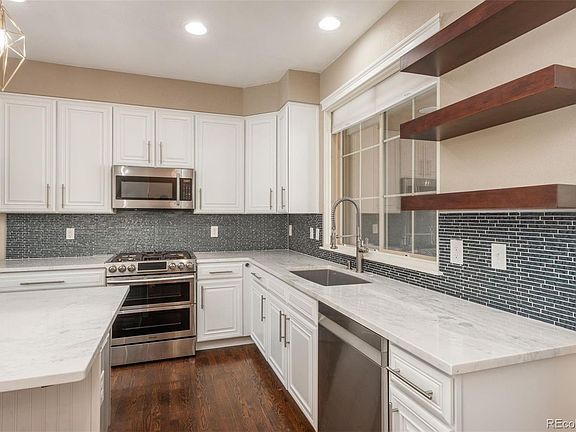 Discover the epitome of chic urban living at Highlands Ranch Town Center, where these coveted brownstones exude trendsetting style. This home exemplifies the perfect combination of quality, functionality, and tasteful finishes, plus a convenient lifestyle you'll cherish. Upon first impressions at the front door, the spacious front patio offers prime seats to soak in the vibrant town center ambiance. One of the standout features you’ll notice right away is the upgraded hardwood flooring that flows seamlessly throughout. Classic flooring that blends a modern look with timeless charm. Entertain effortlessly in the updated kitchen, equipped with stainless steel appliances, stunning Carrara marble countertops with glass tile backsplash, a large undermount sink, and painted cabinets.