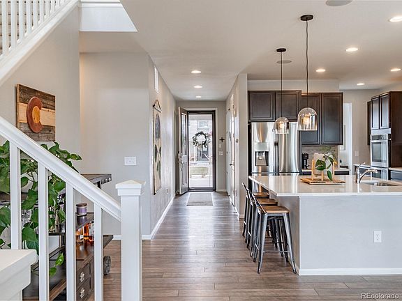 Enveloped in a picturesque mountain landscape, this exceptionally enhanced Candelas home exudes livable luxury. With a harmonious blend of style and function, it boasts an optimal design that caters to every aspect of modern living. Deliberate custom details have been added to every room gifting character and personality to make the home one of a kind. Texture from the rich wood style floors, woven window treatments, ship lap and natural stone cohesively create layers of depth effecting a sophisticated design. The chef’s kitchen manifests a modern streamlined aesthetic from the sleek, clean lines of the cabinetry, smooth polished surfaces of the white quartz and subtle sheen of the stainless appliances. Gather around the expansive center island with wrap around seating where the bonds of family and friendship are strengthened. Vaulted ceilings and a multitude of windows welcome the exterior expanse of mountain views and blue skies into the family room while the fireplace with stacked stone emanates a warm ambiance. The main level office is embraced by opaque panel doors inviting natural light to stream freely through the walls. Escape to your luxurious owner’s suite where oversized windows frame the mountain views that become the art work on your walls. Floor to ceiling tile in the expanded shower with euro style glass and a dual sink vanity with framed mirror create a seamless look. The finished basement is crafted for fun offering interactive media and game areas, a personal training room, and an impressive wet bar that rivals some kitchens. A fifth bedroom enjoys a personal bath with a steam shower. Venture outside onto the covered back patio adorned with a charming pergola and twinkling bistro lights and allow yourself to be captivated by the awe-inspiring views and remarkable sense of privacy with the greenbelt behind. The highly acclaimed Three Creeks K-8 is conveniently located across the street and fully paid solar panels keep your utilities affordable.