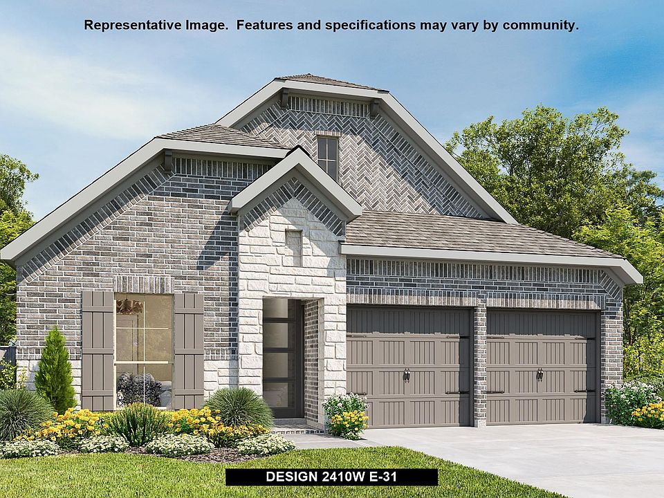 Coffered extended entry leads past game room to open kitchen, dining area and family room. Kitchen features deep walk-in pantry and generous island with built-in seating space. Dining area features curved wall of windows. Family room features wall of windows. Primary suite includes bedroom with wall of windows. Double doors lead to primary bath with dual vanity, garden tub, separate glass-enclosed shower and oversized walk-in closet. Abundant closet space and large windows add to this spacious four-bedroom design. Covered backyard patio. Mud room off two-car garage.