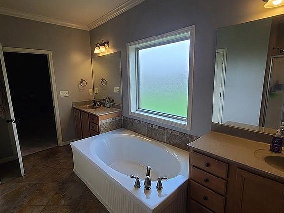 - Linen Closet, Walk-In Closet(s), Stone Counters, Soaking Tub, Crown Molding, Tub/Shower Combo, Smooth Ceilings, 9 Feet +