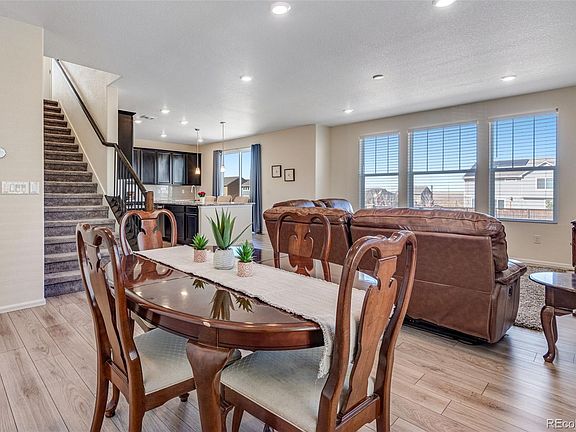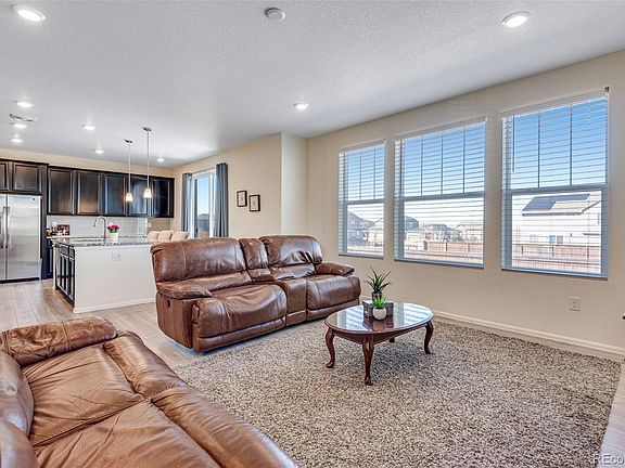 Stunning two-story home in Buffalo Highlands offers the perfect space for modern living. Imagine starting your mornings with a cup of coffee at the kitchen island, surrounded by sleek granite counters, gas stove, stainless appliances, and a spacious pantry. The open-concept design seamlessly flows from the kitchen to the dining and living areas—ideal for gatherings or quiet evenings at home. After a busy day, retreat to the peaceful primary suite, where you can unwind with breathtaking mountain views. The luxurious en-suite bathroom, with its serene atmosphere and spacious layout, feels like your personal spa. Upstairs, the oversized secondary bedrooms provide plenty of room for all, and two feature walk-in closets for added convenience. The finished basement is perfect for a media room, a hobby space, or an extra guest suite. With a full bath, kitchenette with quartz counters, and cozy living area, it’s a versatile retreat for any occasion. On a corner lot with no back neighbors you can enjoy grilling with friends on the large concrete patio or playing with your favorite four legged friend in the spacious grass area. The 3 car garage allows for plenty of parking or storage. Enjoy the vibrant community with nearby parks, a new school opening this Fall, and regular neighborhood events like movie nights. Easy access to DIA and major highways, you're never far from dining, shopping, and entertainment. Come see how this home can be the perfect backdrop for your everyday life!