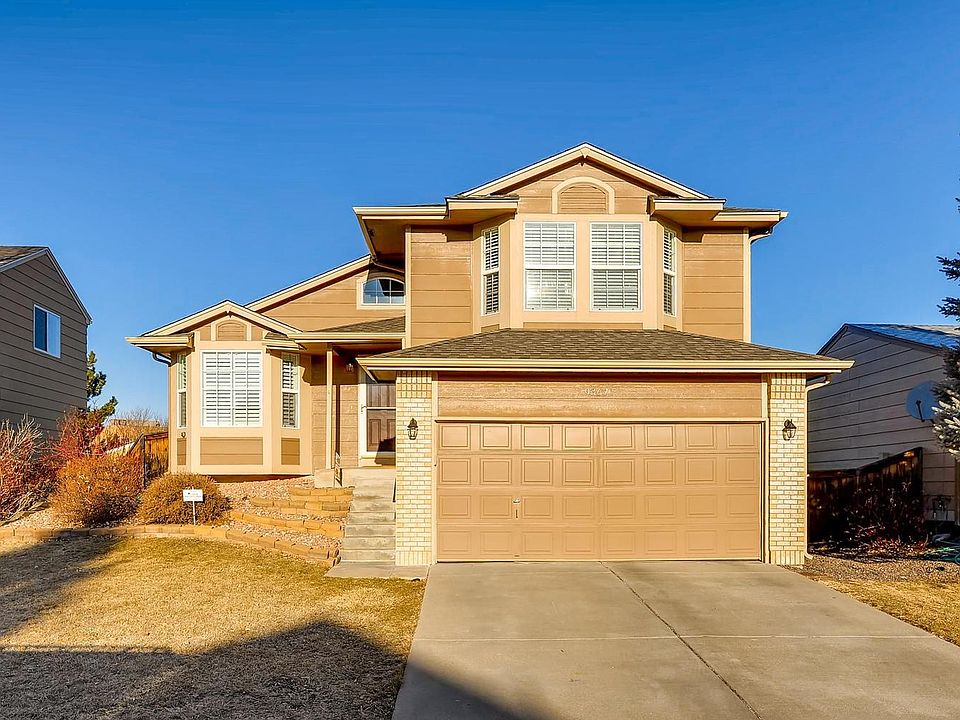 Well-maintained family home features large lot on quiet cul-de-sac. 2-story entry opens to living room w/ bay window. Crisp new plantation shutters throughout main level. Eat-in kitchen includes stainless dishwasher, microwave, & stove/oven. Family room fireplace has handsome wall-to-wall brick surround with mantle. Master suite has private full bath, and secondary bedrooms are serviced by 2nd full bath. Non-conforming finished 4th bedroom in basement also works great as a craft room, office or workout space. Enjoy sunset views & grilling on back deck. Deep yard has room for kids & dogs and includes a dedicated garden space. Basement has ample storage space. Brand new roof and gutters! Newer A/C. Walk to middle school & high school. Walk/bike to parks & rec center. Minutes to highway, mall, golf. Vibrant community includes 4 rec centers with pools, tennis, fitness, 70 miles of trails & 2,500+ acres of open space. A great choice for buyers who prefer no neighbors directly behind!
