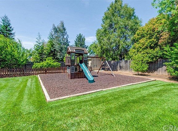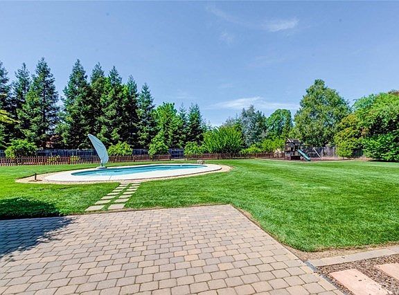 Pristine home on 1.16 acre lot in desired Durham neighborhood just blocks from acclaimed Durham schools and charming downtown Durham. This home has it all! Off the large entry are the formal living room and formal dining rooms. Then you enter the open greatroom that consists of the kitchen, breakfast nook and family room with built-ins and fireplace. The kitchen has lots of granite countertop space and ample cabinetry and includes stainless appliances including gas cooktop and built-in oven and microwave. The bedrooms are split with the master suite on one side and two huge bedrooms and a bath at the other end and a 4th bedroom and 3rd bath also separate for added privacy - perfect for guests! The master suite is very oversized with room for a seating area, and the master bath has a walk-in shower, huge walk-in closet, large garden tub and separate commode with door. The yard is immaculate and offers massive lawn area, playstructure, ingound pool, garden areas, numerous fruit trees, new 10'X14' wooden shed and side gate with RV parking. Leased solar provides for low cost of ownership.