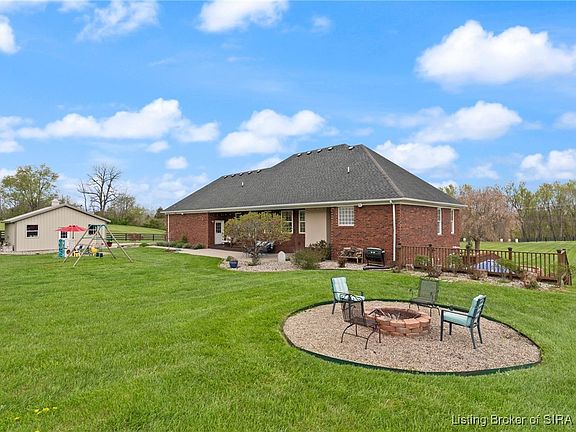 This Beautiful Brick Ranch offers over 3400 sq. ft. of finished living space, on over 3 acres, just min. from Corydon. 3 Bedrooms and 3 full baths, it's perfect for families looking for plenty of room. The walkout basement provides extra space for work, play or hobbies. The first floor offers a formal dining room, an eat-in Kitchen, and a living room with a cozy fireplace. the large master suite features a spacious bath with a soaking tub and a separate shower. The lower level offers a Family room with a beautiful stone fireplace, an office, a full bathroom, and a play area. 2 car attached garage. Enjoy outdoor living on the covered porch and patio area, ideal for relaxing or entertaining. The fenced yard is great for kids or pets. Need extra storage? Check out the detached garage. New Roof will be installed prior to closing. Active bee hives. Please keep a distance of at least 20 feet.