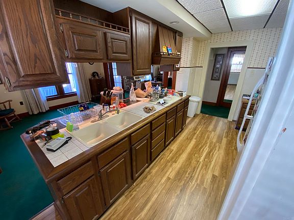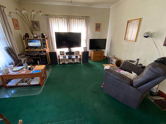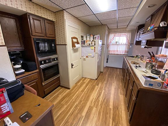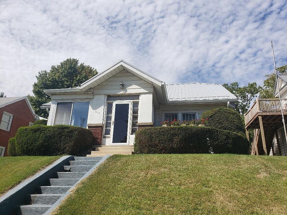 Well Maintained hilltop 2 bedroom 1 bath home. Attic has walk-up stairs and potential to finish for additional living space. The attractive metal roof is 3 years old. The full sized dry basement is unfinished and boasts 2 work benches. The roomy bedrooms are 15 x 11 and 13 x 12. Bathroom boasts a walk-in shower, vanity, with tile flooring. The kitchen island has a built-in GE range, and sink. There are 2 built-in ovens, pantry, some replacement windows. Patio in the back and some fencing. There is a one car detached garage with opener. Complete with central air.