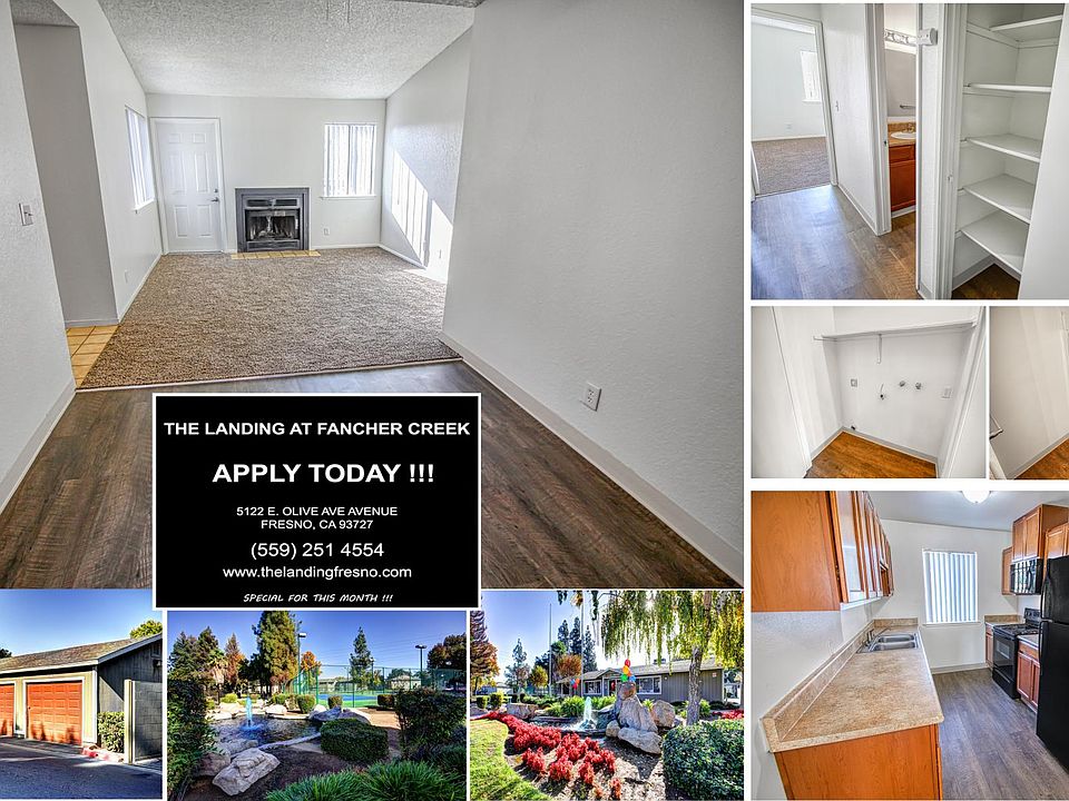 Now, we are open for tours from Monday to Saturday. We would be happy to welcome you to come for a tour of our property. * 2 Bed & 2 Bathroom * 889 Sq. Ft * Rental price $ 949.00 to $ 1,099.00/mo. * Application Fee $30.00 for each adult (18 years old or older) * Holding Deposit $200.00 (Full Refund) * Security Deposit: $1,000.00 * Pets (dog and cat) are friendly. * Washer and Dryer Hookup and on-site laundry facility Specials $200 off 1st-month rent The Landing at Fancher Creek rests peacefully against the green panorama of Fresno with it is garden-style architecture, blue lakes, and waterfalls surrounded by soaring evergreen trees. Throughout its landscaped grounds you'll find a host of amenities crafted for functional comfort and contemporary style inside and out. Nearby you'll find shopping centers featuring neighborhood shops and services and just a short drive away is the Fashion Fair and Sierra Vista malls, a one-stop shopper's paradise featuring large anchor stores and a full list of retail shops and restaurants. Local schools within walking distance and easy access to the 180, 168, and 99 freeways bring everything close to home. You're minutes from downtown Fresno and a short drive to the Bay Area and Yosemite National Park. FEATURES: - 1, 2, & 3 bedroom available - Three swimming pools & Jacuzzi's - Two Tennis courts - On-site Laundry Facility - Washer and Dryer Hook-ups - Gated community - Carport Parking - Central Heat and air - Fully equipped Kitchen - Maintenance On-site - Breathtaking Landscapes - And much more! EQUAL HOUSING OPPORTUNITY PRICES AND AVAILABILITY ARE SUBJECT TO CHANGE WITHOUT NOTICE. -- Leasing Office: THE LANDING AT FANCHER CREEK APARTMENTS Address: 5122 E Olive Ave., Fresno, CA 93727 Office Hours: Monday through Friday from 8:00 AM to 5:00 PM Saturday from 8:00 AM to 4:30 PM