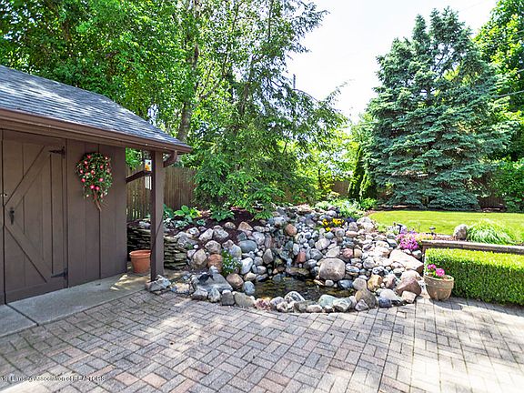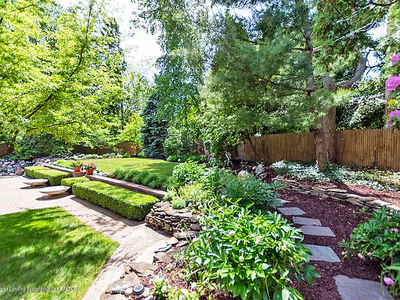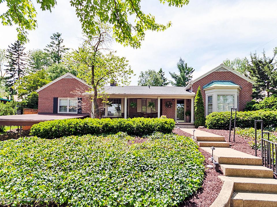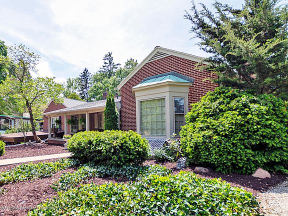 Situated in the heart of East Lansing's popular Glencairn Subdivision, only 3 blocks to the new elementary, this 3 bedroom, 3 1/2 bath, all brick, ''Hollywood House'', ranch includes a vast array of windows and views. The front has a 230 sq' ft. covered porch with concrete steps to the double carport and 2 plus, attached, finished/heated garage. The railings are custom hand-forged steel and wrought by the same artist that created the hammered curved railing attached to the wide front steps. The home opens into a foyer with two closets both of which have automatic ''light-on'' solid core five panel doors. Open access to both LR and DR.