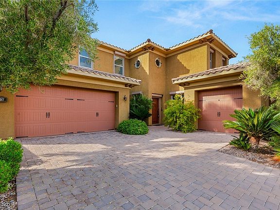 This European-inspired, former model home sits on a premium golf course lot in the guard-gated community of Tuscany, offering breathtaking golf course, mountain, city, and Strip views. Spanning nearly 3,800 sq. ft., this immaculate residence features spacious bedrooms (with an optional 5-bedroom layout), 3 full baths, a 3-car garage, vaulted ceilings and Rolladen Rolling Shutters placed on the entire home which cost $50,000.00. Inside, you will find custom cabinetry, a gourmet kitchen designed for both style and functionality. The downstairs den with a full bath provides a flexible space perfect for a home office or guest suite, while the loft upstairs offers additional living or entertaining options. From the dramatic staircase with wrought-iron railings to the thoughtfully upgraded finishes throughout, every detail exudes elegance and craftsmanship. Enjoy the stunning views from your backyard oasis. Residents of Tuscany Village enjoy world-class amenities. This home truly has it all!