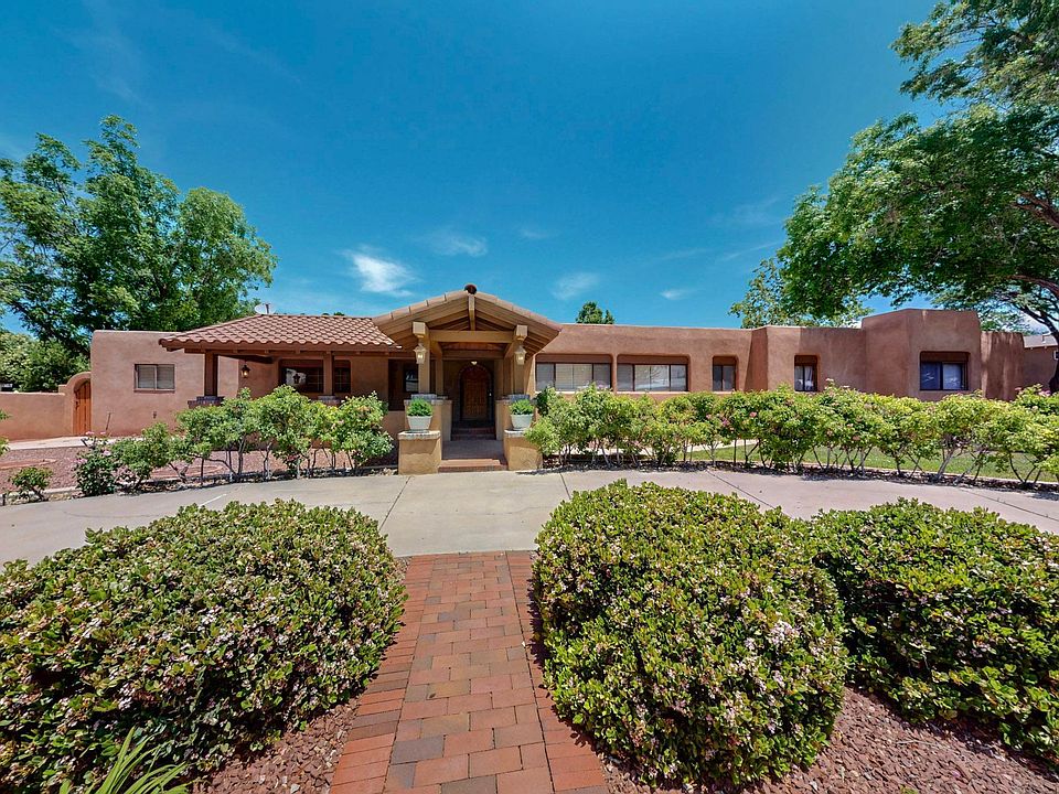 Santa Fe-style living in this stunning 4,509 s.f. estate nestled near the Rio Grande in North Valley's Lee Acres neighborhood. This home combines natural beauty with traditional New Mexican charm, featuring a sparkling pool, gazebo, and outdoor kitchen - ideal for entertaining. Architectural highlights include authentic Southwestern design, custom tile work, various hardwood flooring, vigas, and knotty alder built-ins that add warmth and character. The property offers a unique property w/ attached living quarter with its own kitchen, primary bedroom, and private yard, providing versatility and comfort for extended family or guests. With 5 bedrooms, 7 baths, 6 custom fireplaces, and two living areas, this rare gem is perfect for families and entertainers alike