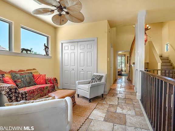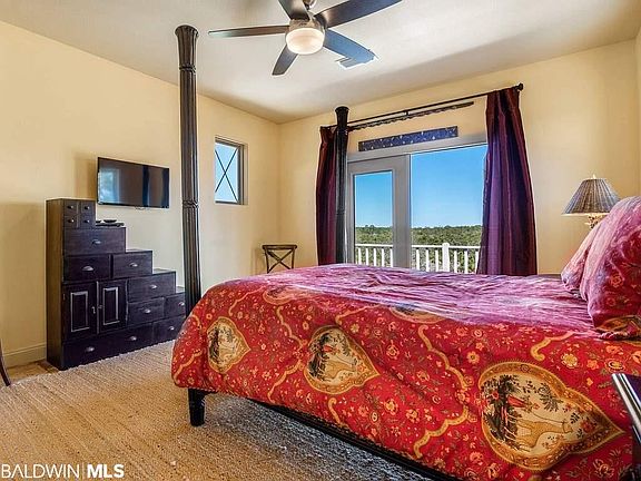 This home backs up to the Bon Secour National Wildlife Refuge. Such homes rarely come on the market. Must see view is from the crow's nest! The 2,900 sq ft house offers three stories, four bedrooms and three full baths. There is a large living/dining area, a screened porch, a crow's nest and a convenient one car garage and a golf cart that conveys. Antiques, etc convey too. Downstairs has spacious living room with 60" TV/DVD and plenty of seating. The living area is open to the dining room and fully appointed kitchen with granite counter tops and breakfast counter, refrigerator, microwave, Gaggia Espresso Machine and Coffee Grinder, dishwasher and laundry area with full size washer and dryer. Just off the living and dining room is a screened back porch with plenty of outdoor seating. Also downstairs is a master suite with comfortable seating area, large TV, generous closet and master bath with large garden tub, separate glass enclosed shower, double vanity and separate commode room. On the other side of the foyer is a guest bedroom with a queen size bed and TV and adjacent full bathroom. While the bathroom is separate from the bedroom, the hall can be closed off by a door to create the privacy and feel of a 2nd master bedroom. Upstairs you'll discover two guest bedrooms and a full bath. A few more steps lead to the furnished crow's nest with panoramic views of the beautiful Gulf of Mexico. The crow's nest features French doors opening onto a deck with gorgeous views of the Gulf of Mexico. Other features include 24 foot ceilings in the living and dining rooms, 10 foot ceilings in all other downstairs living areas, ceiling fans, central heating and air conditioning, Wi-Fi and lots of storage areas.