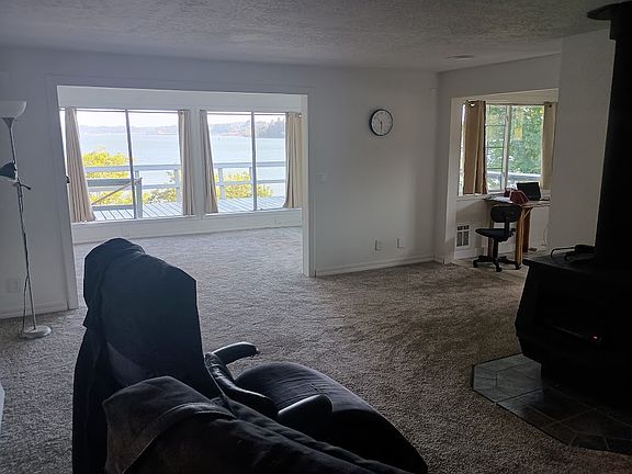 Newly remodeled bayfront home in the Glasgow neighborhood of North Bend with spectacular view of bay and bridge. Located on secluded street off East Bay Road in a quiet upscale neighborhood. All new appliances, carpeting, flooring, painting, electrical upgrades and other updated features. Plenty of parking for your RV and toys and includes a separate 300 sq ft workshop or storage space. Numerous mature plants on property. Large carport and bayfront deck for sunset watchers. One year lease becoming month-to-month thereafter Costs for electricity, water, refuse collection and internet service not included. No smoking inside the house or workshop No subletting or involvement with third parties Landlord requires annual inspection This is a quiet area and tenants must be good nighbors in this small neighborhood Neighbor will perform lawn service and manage property mainenance 6at no cost to tenant