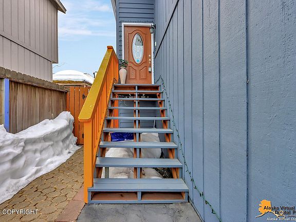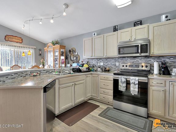 South Anchorage home with open kitchen layout to dining and living room. Large deck through dining. Vaulted ceilings, open kitchen w/breakfast bar & pantry, walk-in closet in primary bedroom.
