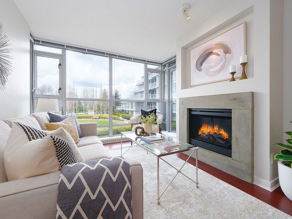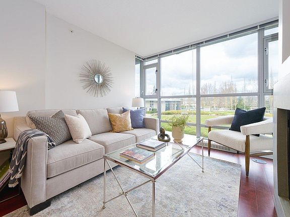 Welcome to mid-rise concrete residences built by Cressey. Lovely 2 bed and 2 full bath with 2 balconies. This sweet home brings ample natural light overlooking a vast open/green courtyard with picturesque backdrop of northern mountains. Features fresh coats of paint in all spaces, floor-to-ceiling windows, hard-wood flooring, sensible closet organizers, SS appliances, gas range, double-sink ensuite bathroom, cozy fireplace and more. The complex offers world-class exclusive access to huge resort-style club house - indoor pool, large gym, sauna/steam room & pool table. Very conveniently located, close to all different levels of schools at walking distance, shopping mall and transit. 1 parking and 1 storage locker. Great pleasure to show.