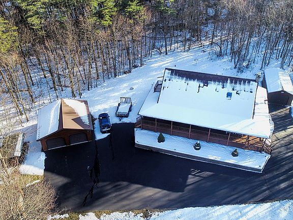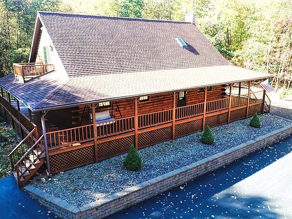 Beautiful log home situated on 5+ acres close to town, State Game Lands, Standing Stone Trail and easy distance to Raystown Lake access. Features include large wrap around covered deck to sit back and enjoy the outdoors. Sit by the woodstove on the chilly days in the large Great Room or enjoy all the natural light in the sunroom. 2 First floor bedrooms and bath in addition to a family room and Master Suite in the loft. Vaulted ceilings, hardwood floors. Roomy basement offers extra space for expansion. Large paved driveway that leads to the Detached garage as well as the extra sheds for storage. Updates include new trex decking, super high efficiency heat pump, new metal roofs on the outbuildings. Definitely a must see home!
