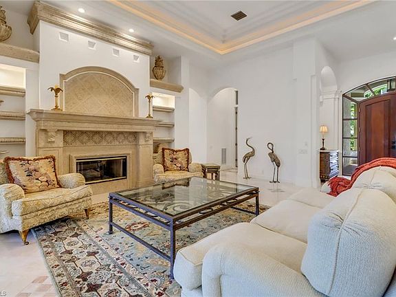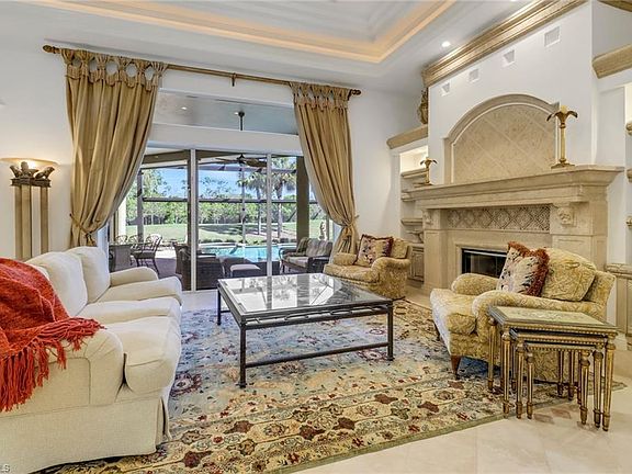 Opulent furnished private home in the gated golf course community of Pelican Marsh, on a large secluded lot in the much sought after Sweet Bay Neighborhood with beautiful views of surrounding golf course and nature preserve in the distance and NO homes across the street. This home has EVERYTHING you’d ever want plus NEW Roof in 2020, NEW Pool cage and screening in 2020, NEW Outdoor Kitchen in 2020, NEWLY painted interior in 2024 and NEW AC in 2019. Featuring 4 spacious bedroom suites, plus an office/den, open kitchen with bar stool seating, a convenient desk, GIANT laundry room with 2nd refrigerator space and a butler's pantry/coffee bar. This home offers many large areas to entertain, including a family room with vaulted ceiling and a full service bar. Outside, a new outdoor kitchen with bar stool seating and picturesque golf course views. Elegant marble flooring, gas fireplace, generous oversize rooms, storage galore, and dramatic 14 ft. ceilings. Walls of sliding doors lead to a desirable 24'x24' salt water pool with overflow spa, on a spacious 1,200 sq. ft. screened lanai. Poolside guest suite offers a full bath & private lanai access. Oversized 3 car garage with workshop and lots of storage. Pelican Marsh offers world class tennis program with lighted courts and tennis shop, pickleball courts, bocce, fitness center with locker rooms, showers, classes and onsite instructors, a new indoor/outdoor restaurant and bar with multiple TV's, plus 4 gated entry/exit choices through the manned gates.